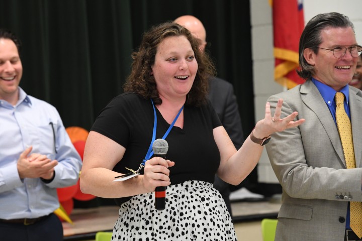 Thomas Jefferson Elementary | Bentonville, AR | Apr 27, 2022With Milken Educator Awards Senior Program Director Greg Gallagher by her side, fourth grade teacher Kamisha Burlingame shares some thoughts with the students, colleagues and guests who just watched her Milken Educator Award surprise.