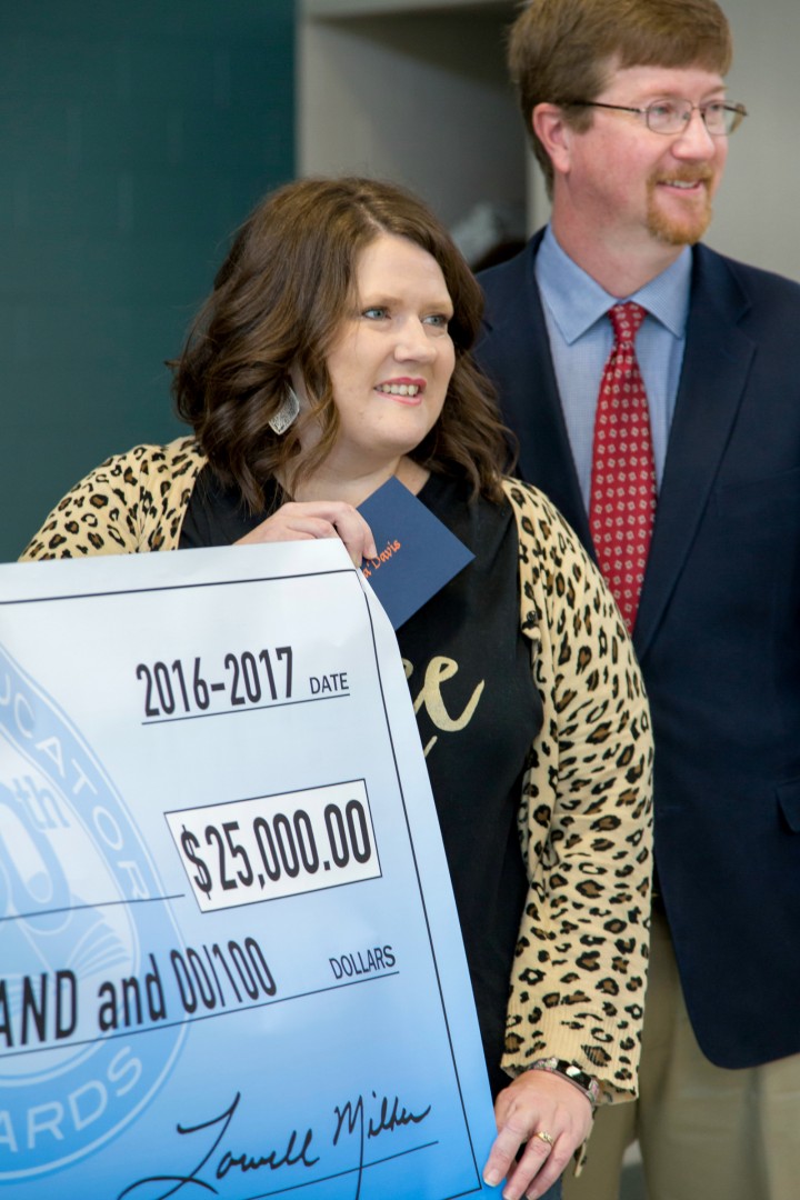 Joe Mathias Elementary School | Rogers, AR | Nov 18, 2016Fourth-grade teacher Kara Davis holds her oversized Milken Educator Award check with Arkansas Department of Education Commissioner Johnny Key. In addition to teaching her students, Davis is committed to nurturing the next generation of educators. She serves as an ambassador for TEACH, a group that recruits students to the teaching profession.