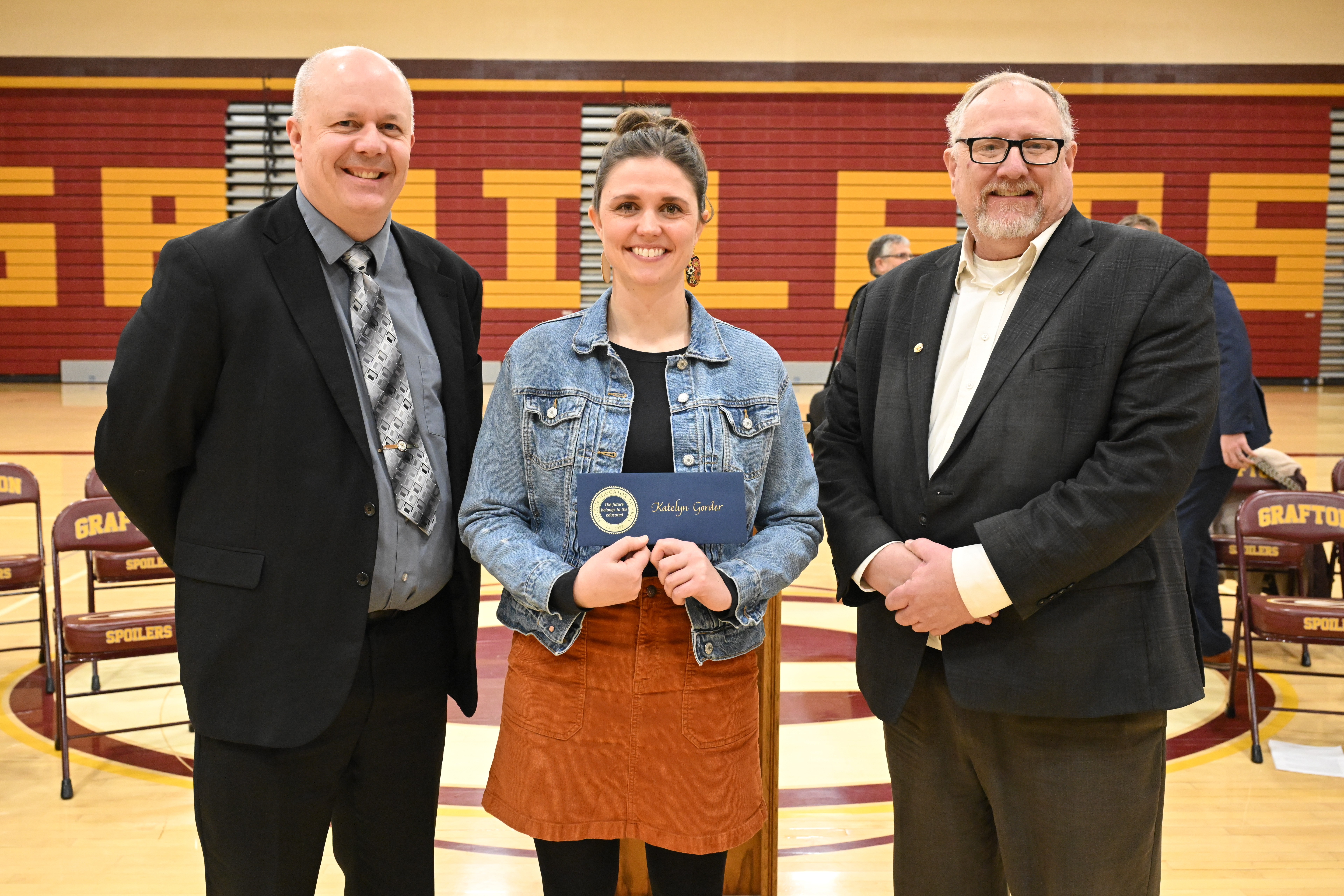 Grafton High School | Grafton, ND | Jan 16, 2024Randy Richards (left), policy director for U.S. Senator Kevin Cramer, and Tom Brusegaard (right), regional director for U.S. Senator John Hoeven, congratulate Milken Educator Award recipient Katelyn Gorder (ND '23).