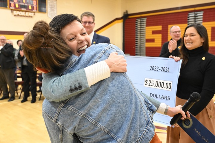 Grafton High School | Grafton, ND | Jan 16, 2024Stephanie Bishop, vice president of the Milken Educator Awards, hugs and congratulates Katelyn Gorder.