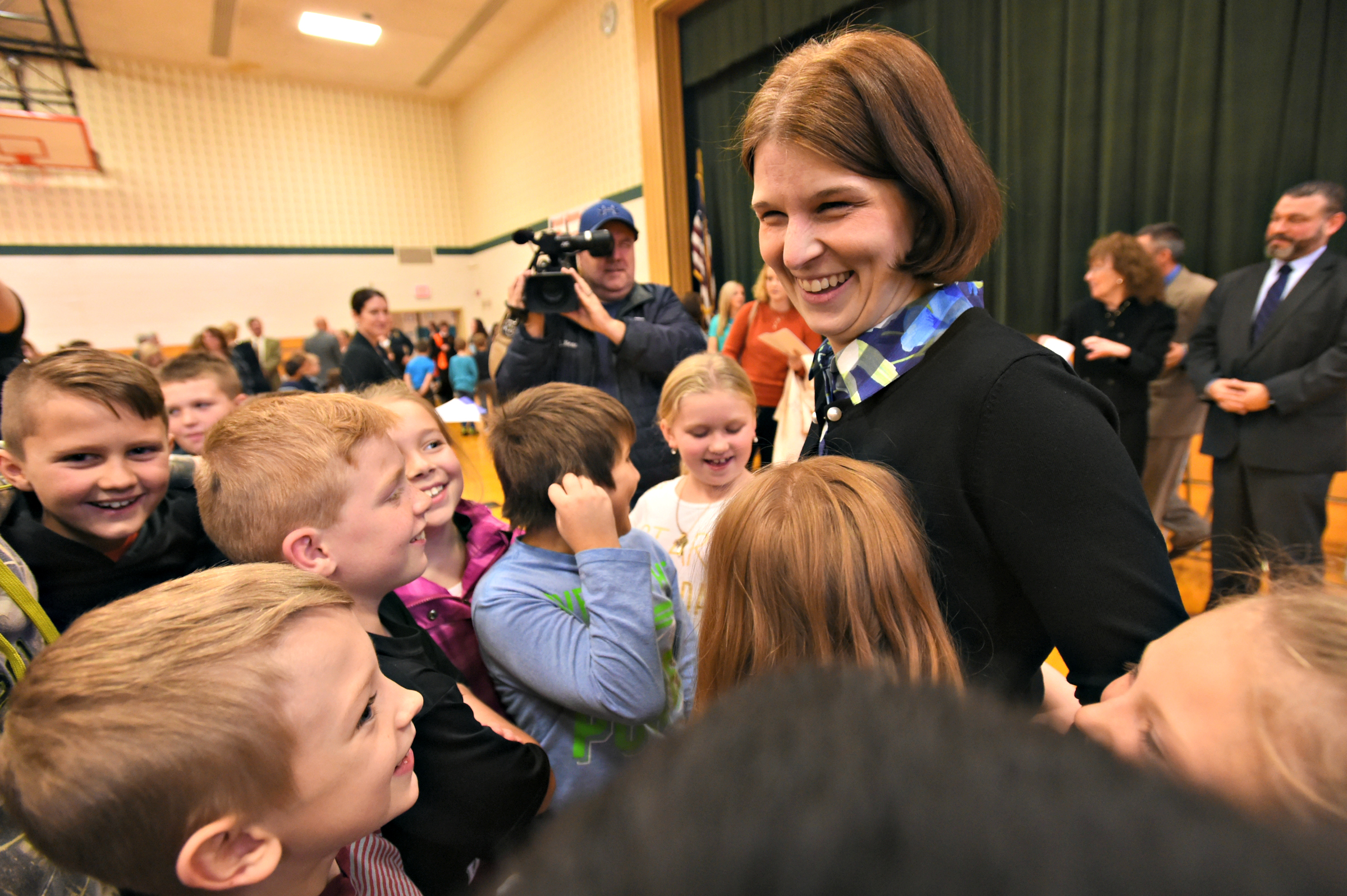 Eagle View Elementary | Somerset, PA | Oct 31, 2018Proud students surround third-grade teacher Katherine Bobby to congratulate her on her surprise Milken Educator Award. Bobby, who taught special education in the Somerset Area School District before moving to a general classroom, creates a warm, supportive atmosphere where each student has a voice. Kindness takes center stage: Bobby’s popular Do One Thing wall highlights things students have done to improve others’ quality of life in school, home or community.