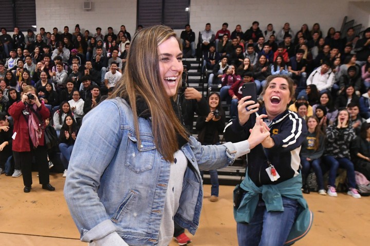 Sunnyside High School | Fresno, CA | Dec 10, 2019A proud colleague reaches out to high-five Katie McQuone as Sunnyside High cheers and applauds.