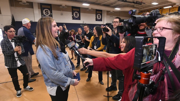 Sunnyside High School | Fresno, CA | Dec 10, 2019DON'T TRIP OVER ALL THOSE TRIPODS, KATIE! Reporters hang on every word from Milken Educator Award recipient Katie McQuone.