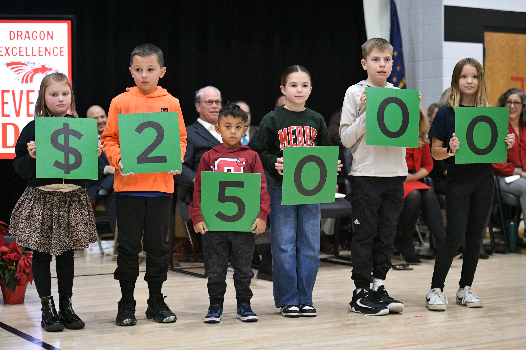 New Palestine Elementary School | New Palestine, IN | Dec 17, 2025The Milken Educator Award also includes a cash prize. How much? One digit at a time, students hold up cards representing the amount. When the third zero is revealed, no one can believe it: $25,000!
