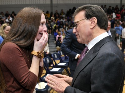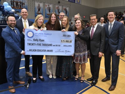 The Northshore High School Panthers are full of school spirit today! Everyone's excited for an all-school assembly to celebrate Northshore's many achievements, including its continued 'A' rating, Top Gains and Opportunity Honoree title. But before long, a special guest takes the microphone with a secret to share. The Panthers go wild when Milken Educator Awards Founder Lowell Milken presents science teacher Kelly Ryan with a Milken Educator Award and $25,000! Click through the photos below to follow the educator's career-changing surprise. Ryan is the first-ever Milken Educator Award recipient in the St. Tammany Parish Public School System and the 2,975th Milken Educator Award recipient on the journey to surprising our 3,000th Milken Educator.