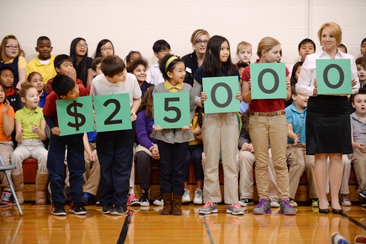 Southport Elementary School | Indianapolis, IN | Jan 27, 2015Volunteers help illustrate the financial prize that comes with a Milken Educator Award, but both they and the entire audience are surprised when one final zero is added to the sum.