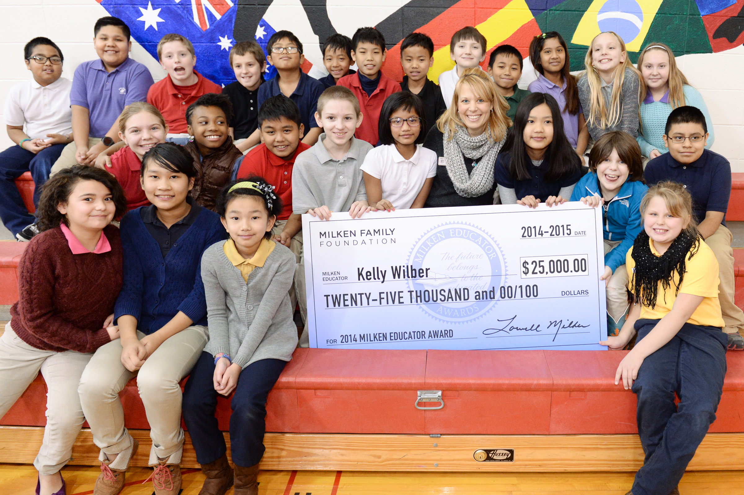Southport Elementary School | Indianapolis, IN | Jan 27, 2015A true class act! Kelly is surrounded by her fifth-grade students proudly posing with their nationally-recognized teacher and her $25,000 check from the Milken Family Foundation.