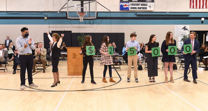 Discovery Middle School | Madison, AL | Mar 04, 2022The Milken Educator Award also includes a cash prize, but no one is sure exactly how much. One digit at a time, students hold up cards representing the amount of the Award. When Alabama Superintendent of Education Dr. Eric G. Mackey holds up a third zero, students start to cheer. That makes $25,000!