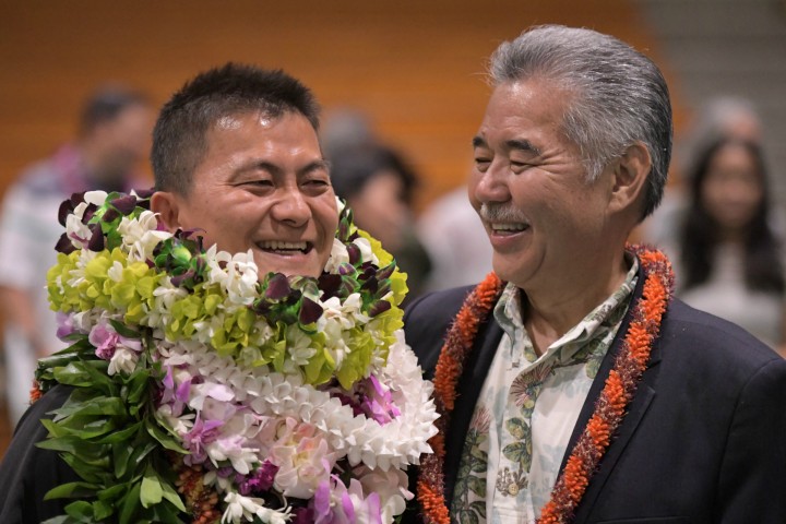 Aiea High School | Aiea, HI | Feb 05, 2018Milken Educator Award recipient Ken Kang and Hawaii Governor David Y. Ige listen to the long ovation from students, staff and guests.