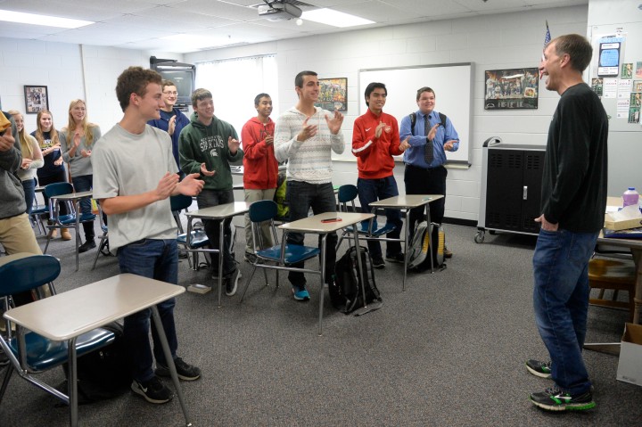 Haslett High School | Haslett, MI | Nov 24, 2015Students stand and applaud for math teacher Kevin Tobe as he returns to the classroom after his surprise Milken Educator Award presentation. Tobe leads both regular and advanced math classes. Of his 41 advanced students, 82% received a score of 3 or higher on the AP Calculus exam.
