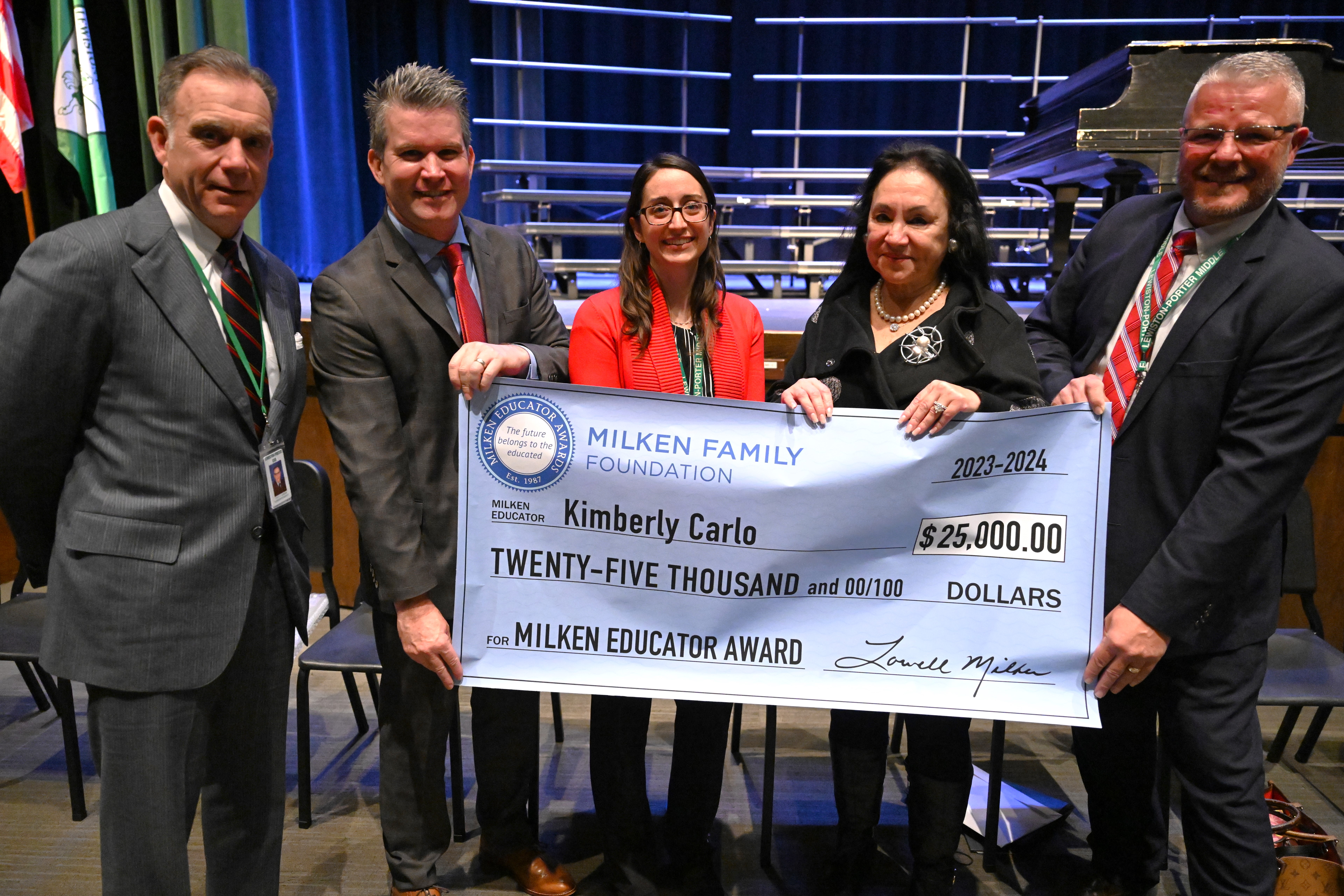 From left, Lewiston-Porter Central School District Superintendent Paul Casseri; Milken Educator Awards Senior Program Director Greg Gallagher; recipient Kimberly Alexander Carlo (NY '23); New York State Education Commissioner Dr. Betty A. Rosa; and Lewiston-Porter Middle School Principal Andrew M. Auer.