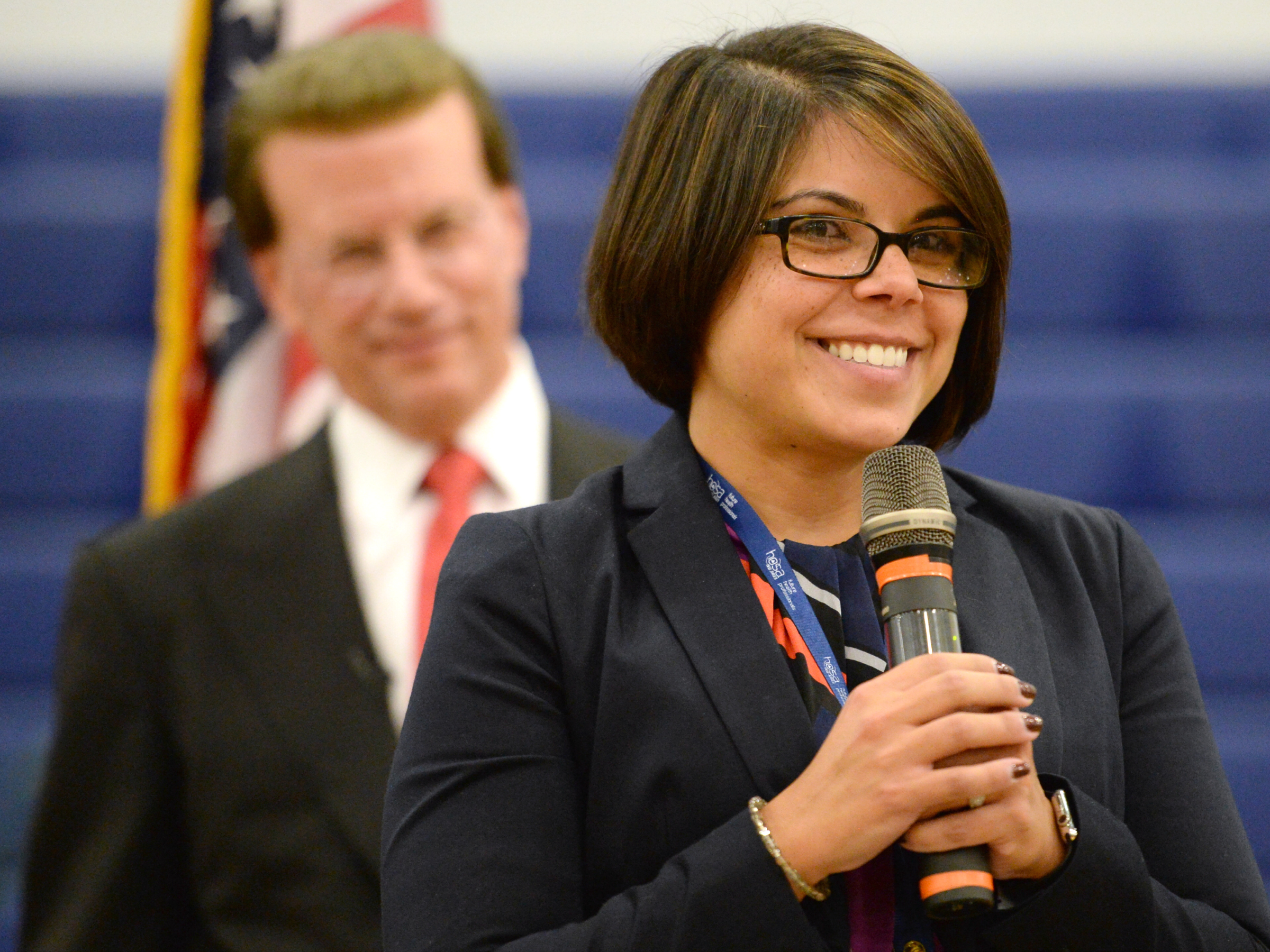 Union City High School | Union City, NJ | October 13, 2015Holding the microphone with a huge smile on her face, newly minted Milken Educator Kimberly Moreno addresses the crowd of students, colleagues and guests as she accepts the 2015-16 Milken Educator Award from Milken Family Foundation Chairman and Co-Founder Lowell Milken. "You guys inspire us to come to work each day," she tells the students at Union City High School.