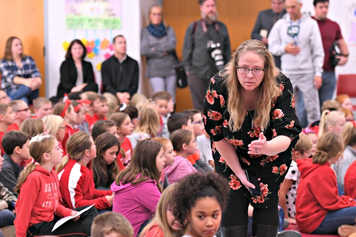 Thornville Elementary | Thornville, OH | Oct 18, 2018With no idea what lies ahead, fourth-grade math teacher Krista Trent helps students find their places for the morning assembly.