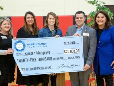 Hilliard Middle-Senior High School | Hilliard, FL | Feb 05, 2020Kristen Musgrove shares some thoughts with the students, staff and guests who just witnessed her Milken Award surprise as Greg Gallagher, senior program director for the Milken Family Foundation, and Hilliard Middle Senior High School Principal Tammy Johnson look on.