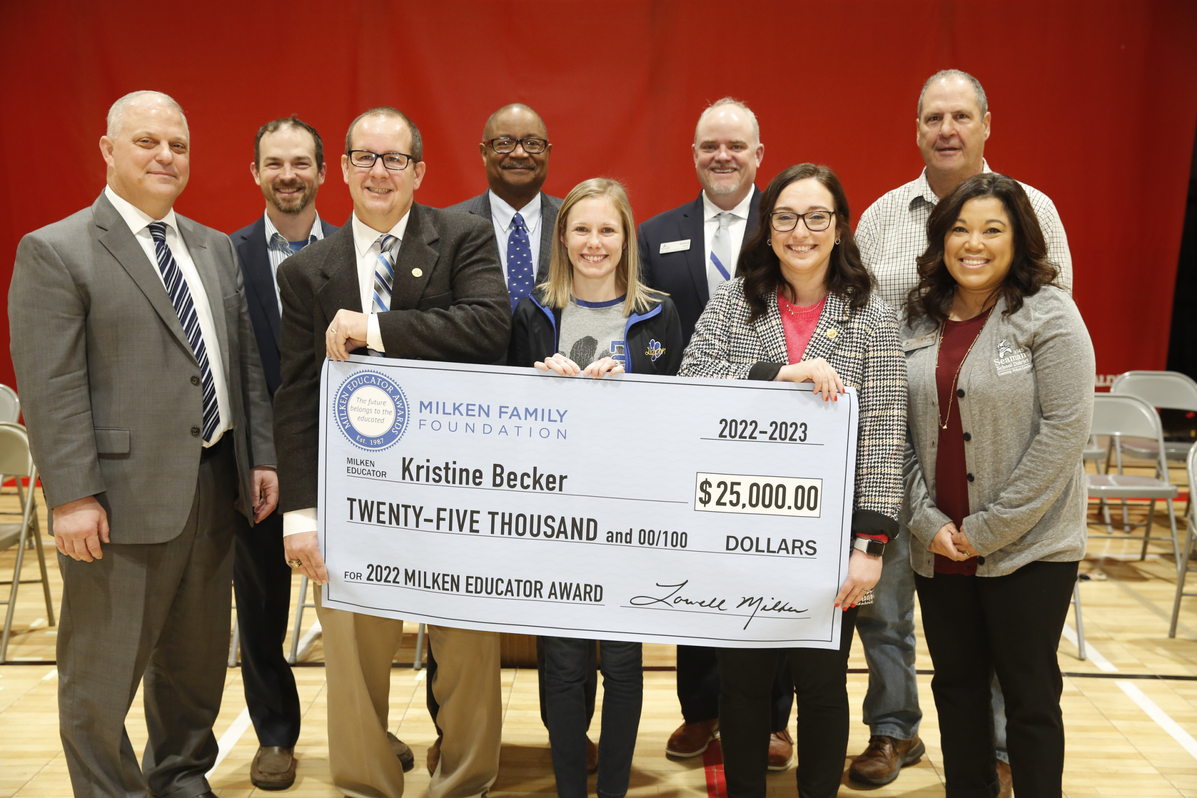 From left, Seaman Schools Superintendent Brad Willson; Seaman Schools Board of Education Vice President Chris Travis; veteran Milken Educator Brad Nicks (KS '09); Seaman Schools Board Member Frank Henderson Jr.; recipient Kristine Becker; Seaman Schools Board Member James Adams; veteran Milken Educator Carly Bowden (KS '19); and Seaman Schools Board Members Kyle McNorton and Christy Weiler.