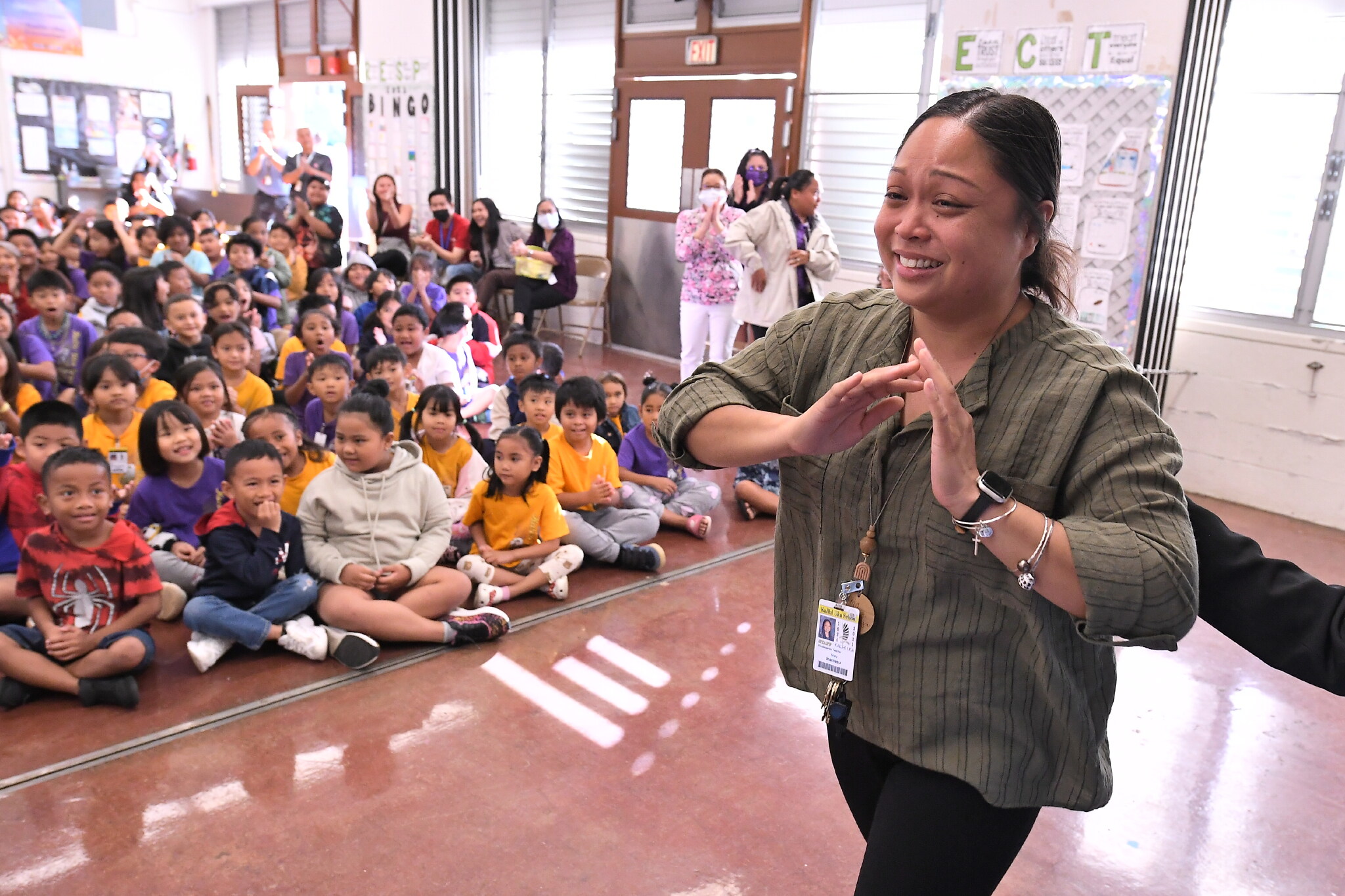 Kalihi Uka Elementary School | Honolulu, HI | Jan 28, 2025Kalihi Uka Elementary School students cheer as kindergarten teacher Kristy Inamasu walks across the gymasium to accept her Hawaii Milken Educator Award.