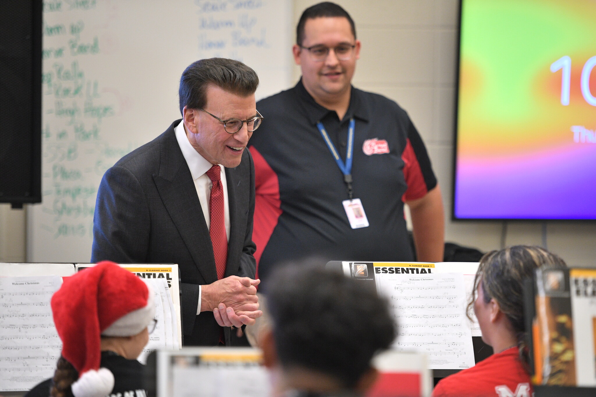 Maplewood Middle School | Sulphur, LA | Dec 05, 2024Back in the classroom, Milken Educator Awards Founder Lowell Milken learns from Award recipient Kyle Cook's band students.
