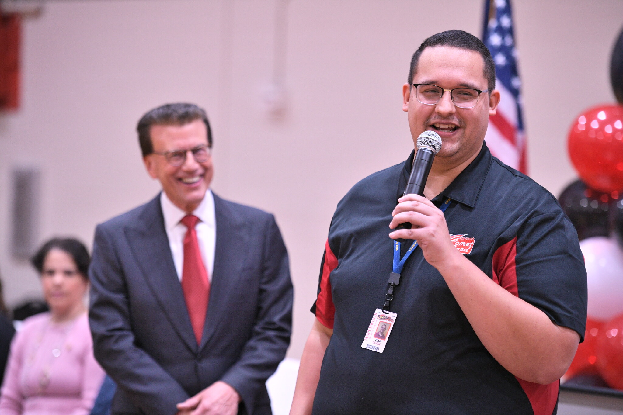 Maplewood Middle School | Sulphur, LA | Dec 05, 2024Kyle Cook addresses the students, colleagues, dignitaries, educators, and press gathered for his surprise notification assembly with Milken Educator Awards Founder Lowell Milken listening behind him. “This job is easy when you have great kids," he says. "Thank you to my band students, and all of Maplewood Middle School.”