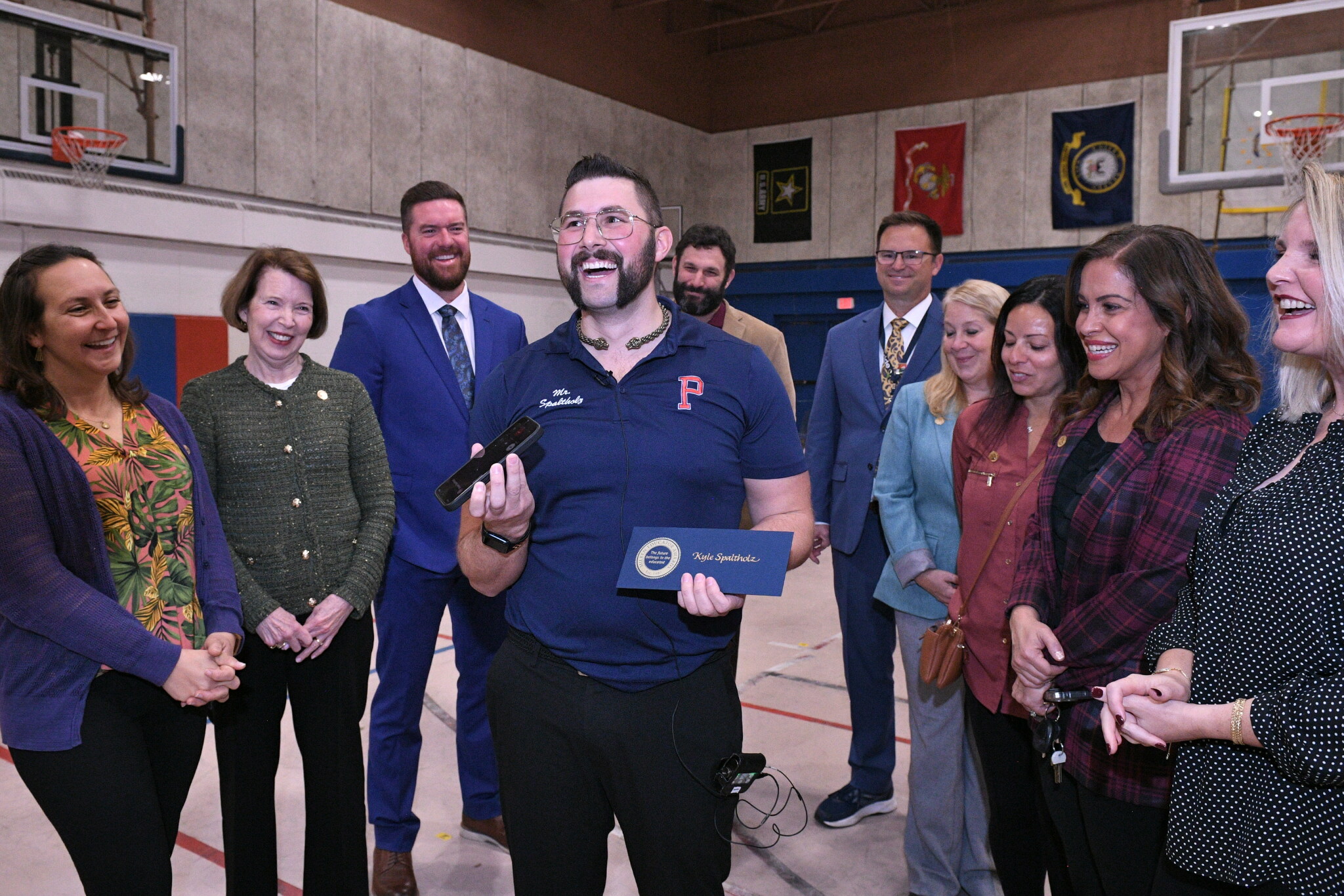 Portsmouth Middle School | Portsmouth, RI | Oct 29, 2025Surrounded by colleagues, Kyle Spaltholz calls his mom to let her know the good news about his new Award.