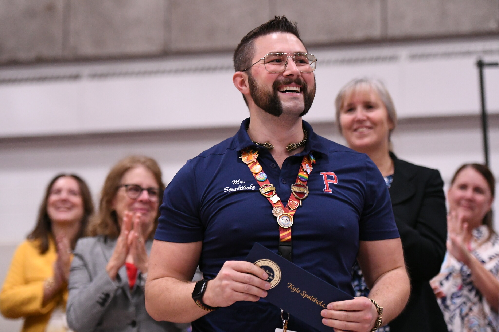 Portsmouth Middle School | Portsmouth, RI | Oct 29, 2025Kyle Spaltholz takes in the applause as he walks up to accept his Milken Educator Award in front of proud students, colleagues, dignitaries and media.
