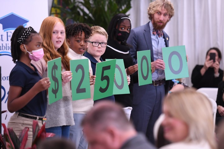 Slaughter Elementary | Slaughter, LA | Mar 14, 2022Everyone wants to know more about the cash prize the winning teacher will receive. Students hold up cards, one digit at a time, representing the amount. When veteran Milken Educator John Lary (LA '15) holds up the final zero, the room begins to hum: That makes $25,000!