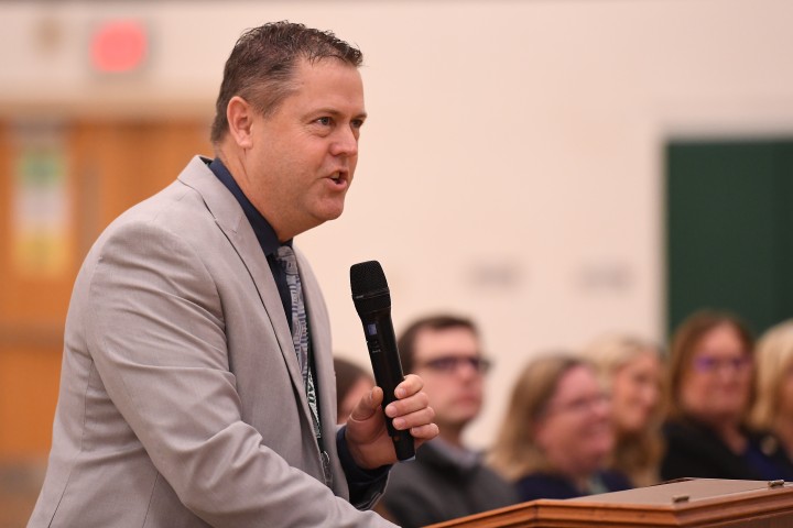 Syracuse-Dunbar-Avoca Middle School | Syracuse, NE | Nov 21, 2023Syracuse-Dunbar-Avoca Public Schools Superintendent David Kraus introduces the special guests attending the morning assembly.
