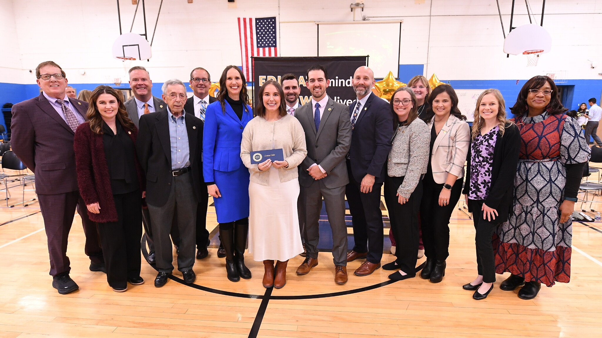 From left: Lowell Milken Center Chief Executive Director Norman Conard (KS ‘92); Meredith Reid (KS ‘24); Bill Smithyman (KS ‘15); Dr. Jim Haas (KS '93); Brad Nicks (KS ‘09); Milken Educator Awards Vice President Jennifer Fuller (TX ‘17); recipient Lexcee Oddo (KS ‘25); Ryan Pfeifer (KS ‘21); Alex Lahasky (KS ‘23); Brad LeDuc (KS ‘13); Carly Bowden (KS ‘19); Dr. Sara Lyn Crump (MO ‘07); Linda Dishman (KS ‘18); Kristine Becker Yulich (KS ‘22); and Jamelle McConnell-Brown (KS ‘07).