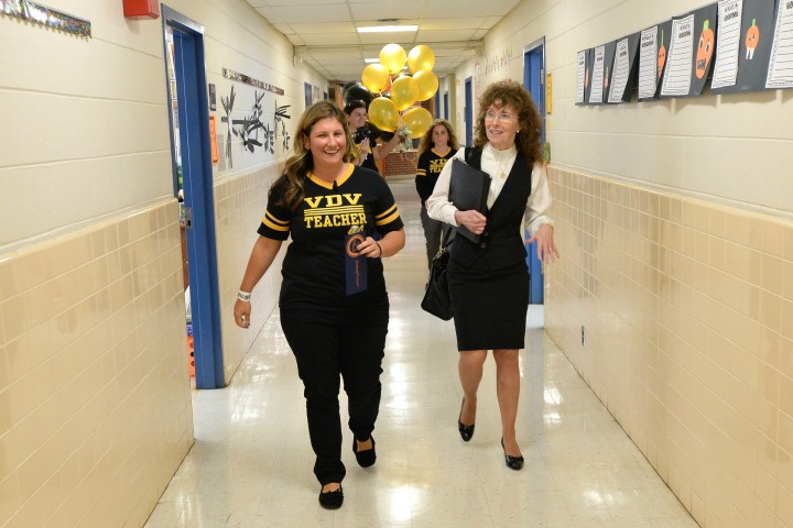 Van Derveer Elementary School | Somerville, NJ | Oct 20, 2016Newly minted Milken Educator Lindsay Frevert and Dr. Jane Foley, senior vice president of the Milken Educator Awards, walk to Frevert's classroom after her surprise notification.