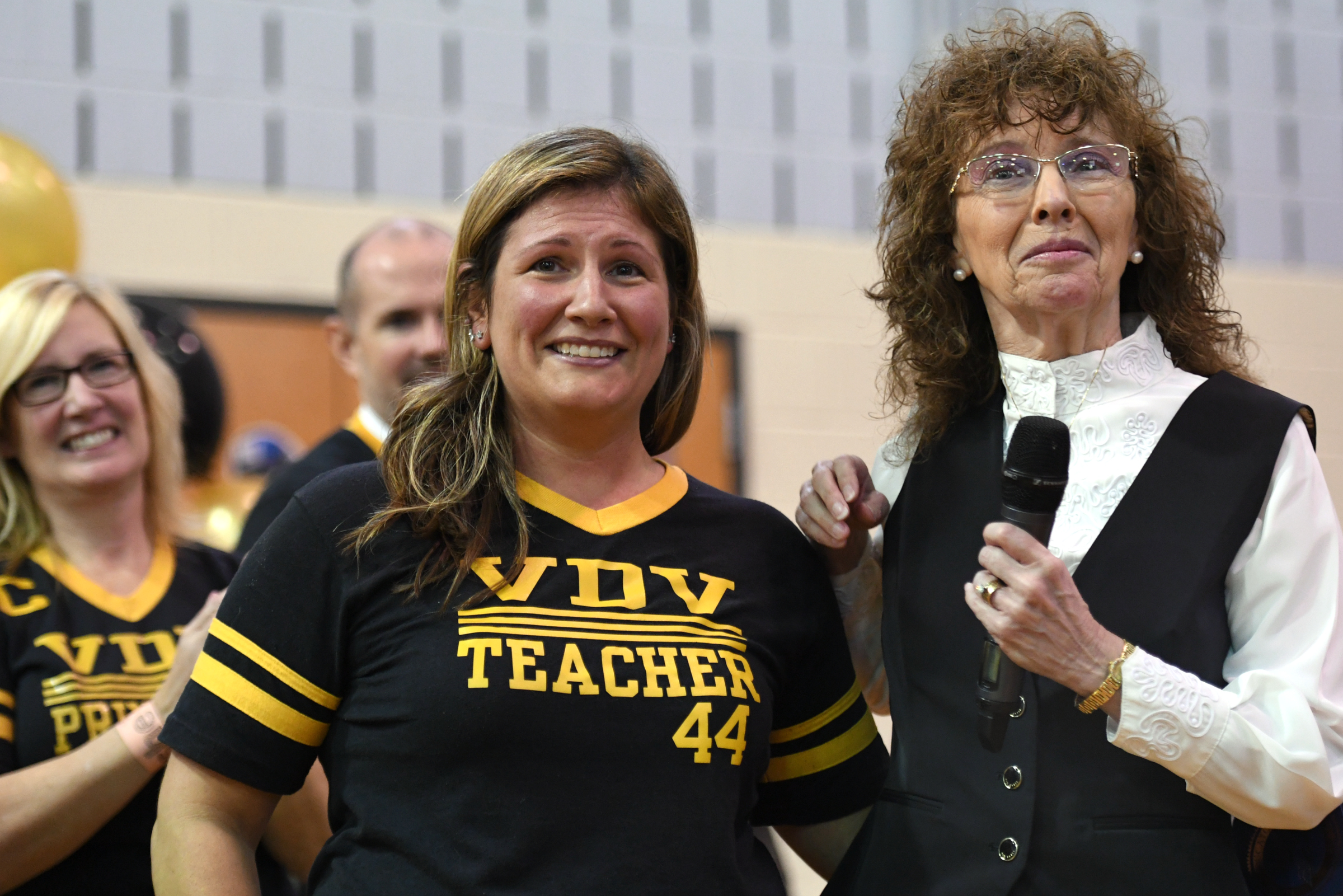 Newly minted Milken Educator Lindsay Frevert and Dr. Jane Foley, senior vice president of the Milken Educator Awards, listen as the Van Derveer community continues its raucous standing ovation. The second-grade-level leader, Frevert has presented at district in-service days on engagement techniques for math instruction, shares her own best practices in the school’s Model Classroom video repository, and is frequently requested as a mentor for new teachers.