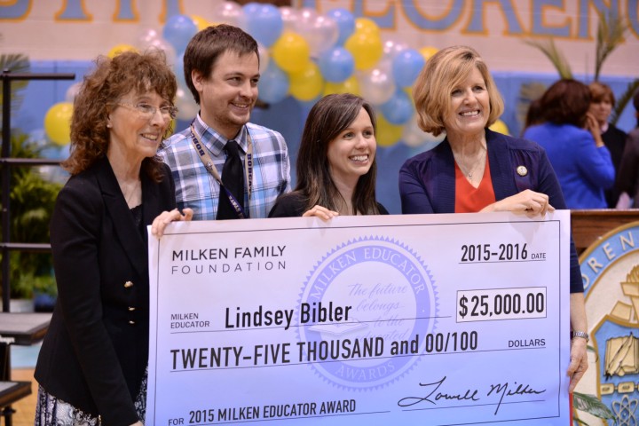 South Florence High School | Florence, SC | Feb 09, 2016Math department chair and new Milken Educator Award recipient Lindsey Bibler holds her oversized $25,000 Award check with help from distinguished guests and husband Joel Bibler, a special education teacher at South Florence High School. Lindsey and Joel Bibler met at South Florence High eight years ago, when both were first-year teachers. From left, Dr. Jane Foley, senior vice president of the Milken Educator Awards; Joel Bibler; recipient Lindsey Bibler; and South Carolina Superintendent of Education Molly M. Spearman.