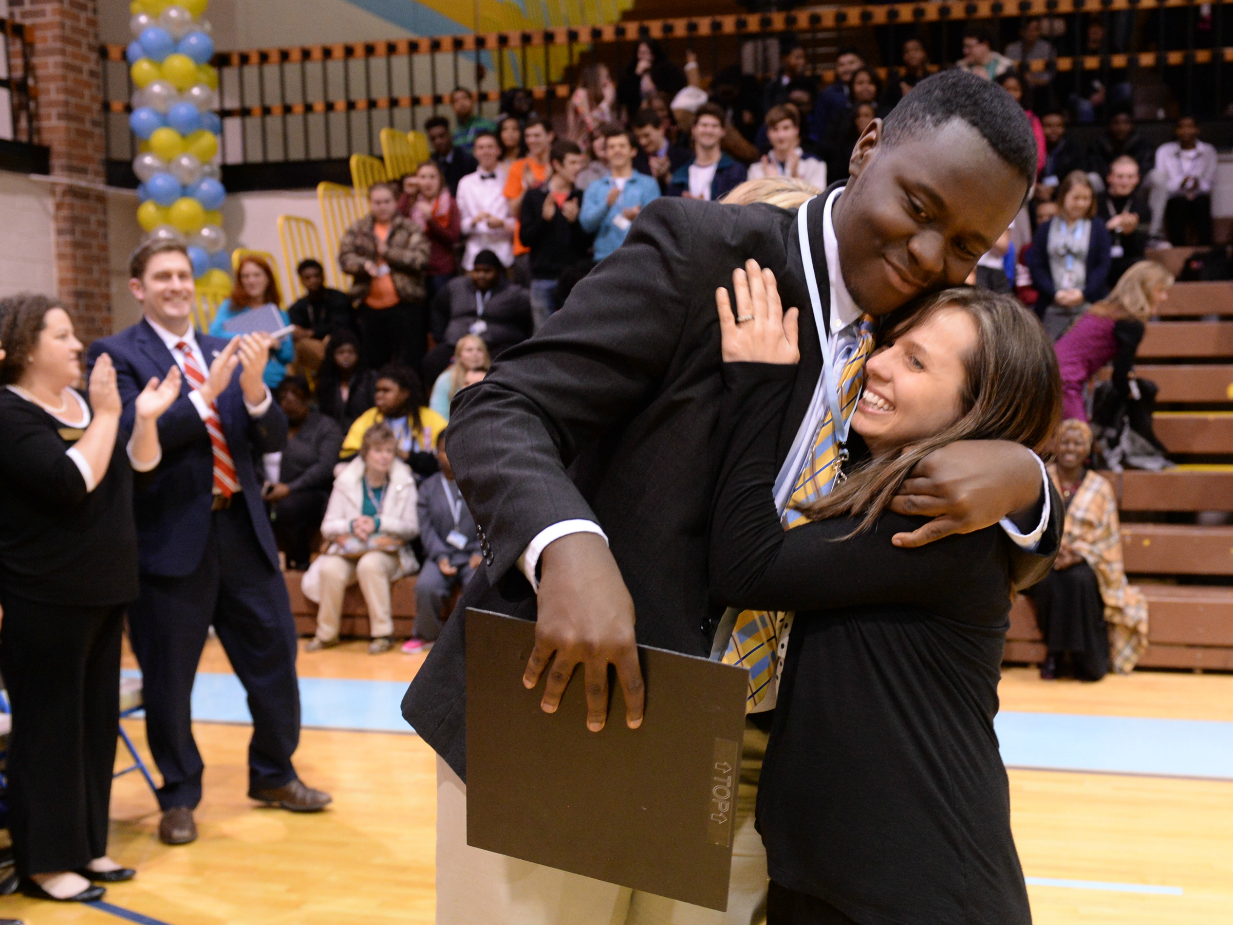 South Florence High School | Florence, SC | Feb 09, 2016Excited students rush to hug math department chair Lindsey Bibler as she makes her way to the front of the gym to accept her surprise Milken Educator Award. KeJuan Robinson, pictured here, says Bibler is his favorite teacher. "Congrats to the best teacher I know for winning the Milken Award," he posted later on Twitter. "Nobody deserves [it] more than Mrs. Bibler."