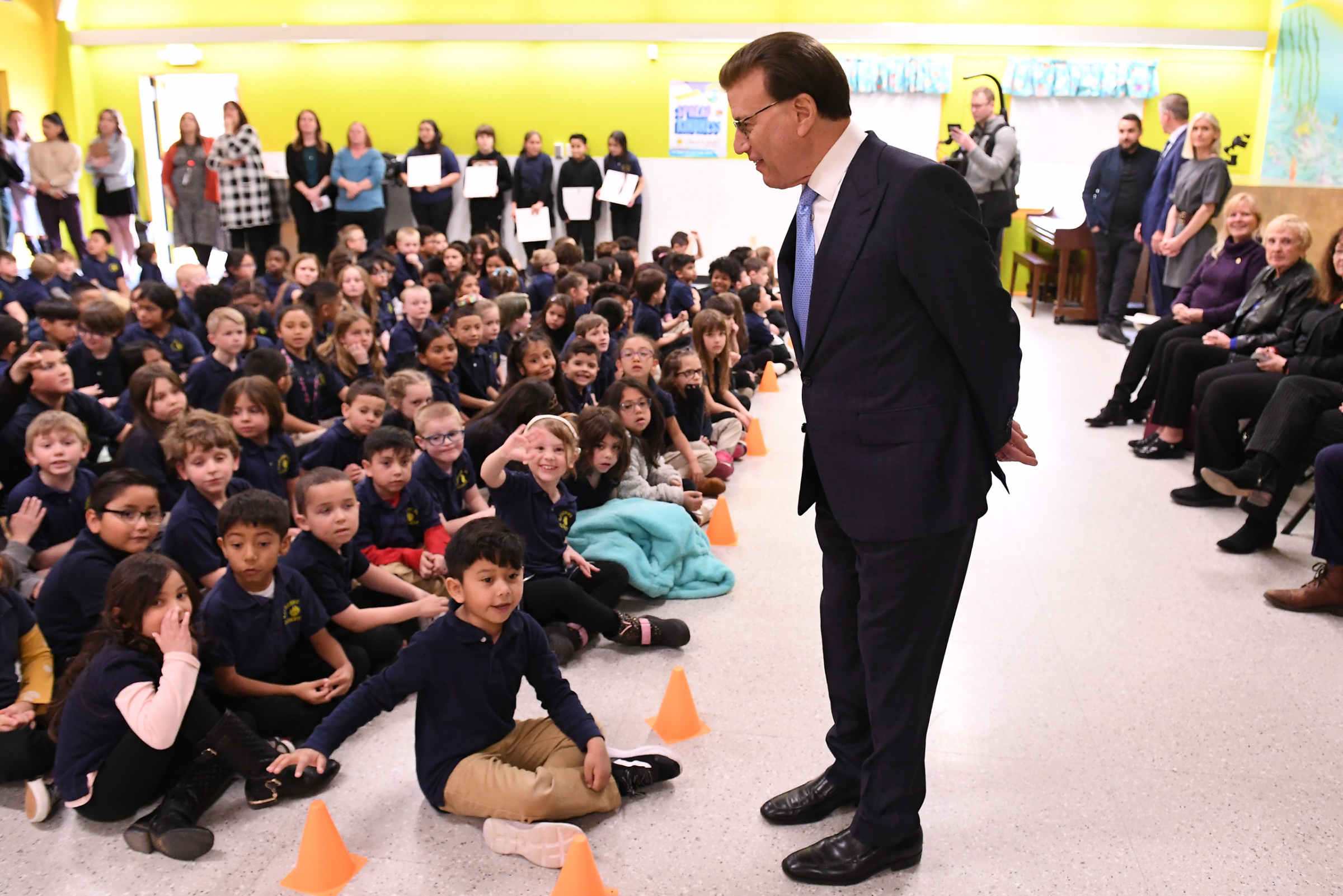 Katherine Dunn Elementary School | Sparks, NV | Feb 07, 2023Milken Educator Awards Founder Lowell Milken talks with Katherine Dunn students before the assembly begins. Does anyone know the reason for today's event? None of the students are quite sure.