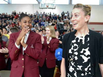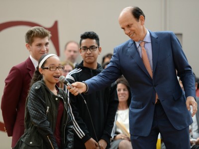 Glen Cove High School | Glen Cove, NY | Nov 04, 2015Milken Family Foundation Co-Founder Mike Milken jokes with members of Glen Cove High School's Select Chorale before the assembly begins. Milken wants to know if he can join the group, which will be performing in Rome later this year.