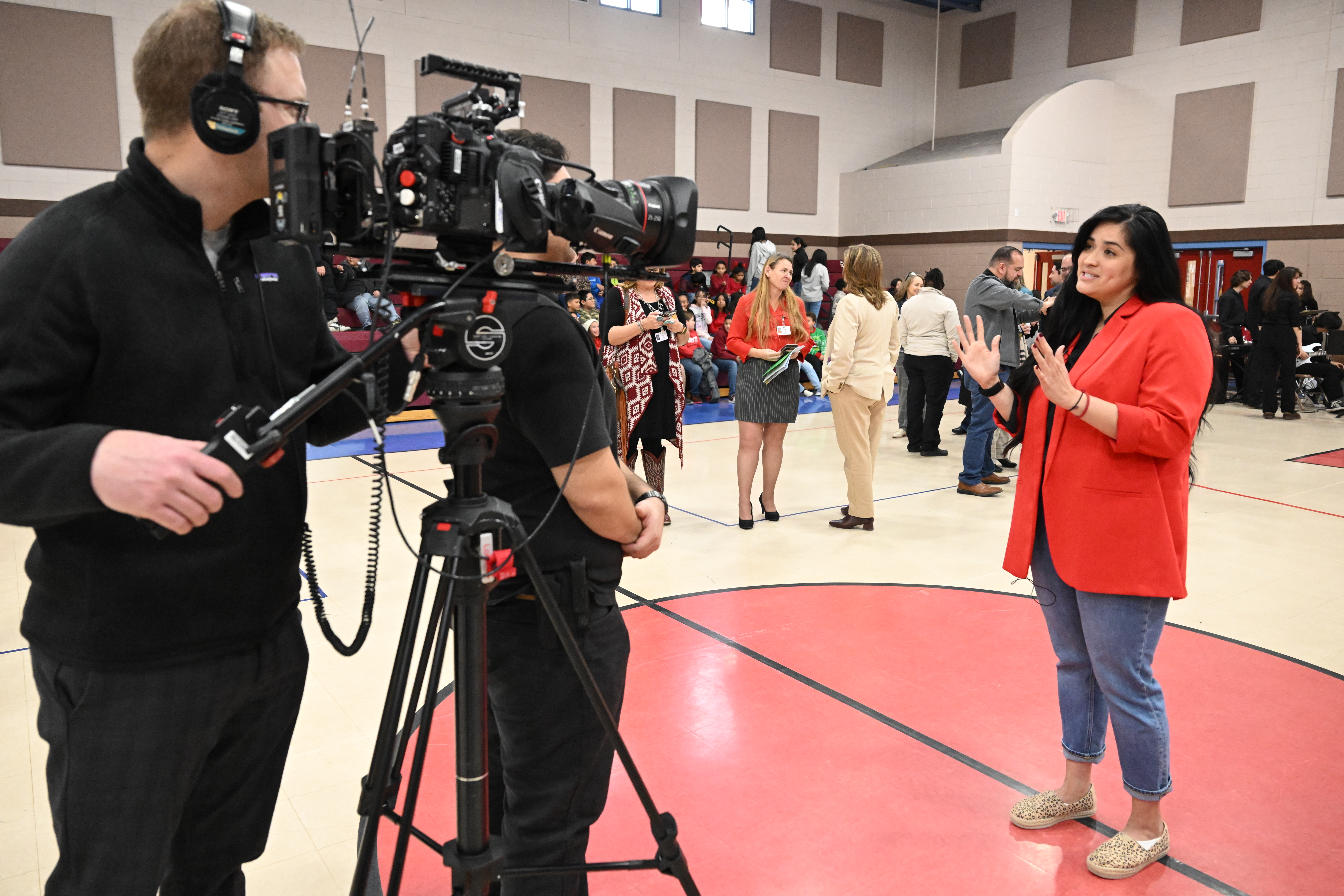 Ruben S. Torres Elementary School | Deming, NM | Dec 12, 2023Magali Gomez talks with the media after her surprise Milken Educator Award notification.