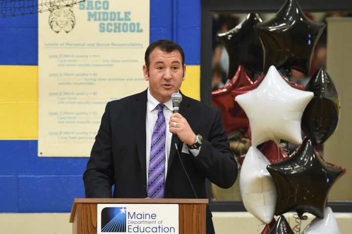 Saco Middle School | Saco, ME | Dec 10, 2015Saco School Department Superintendent Dominic DePatsy greets the assembly and brings up the next speaker.