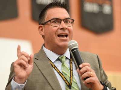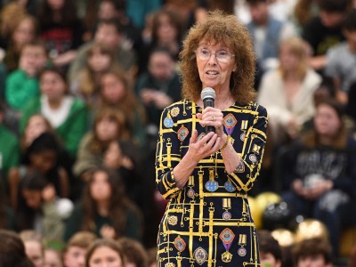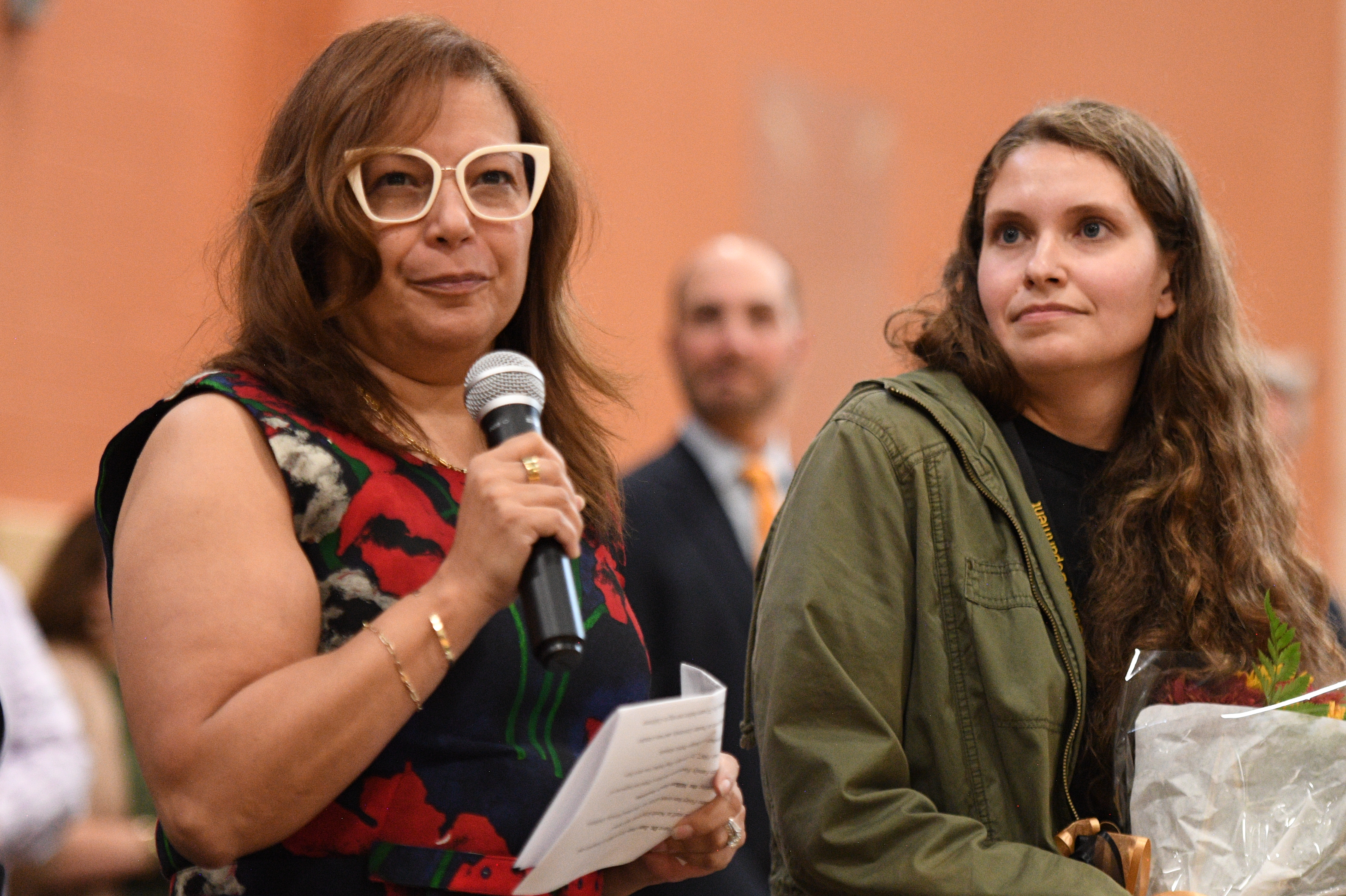 North Kingstown High School | North Kingstown, RI | Oct 10, 2023Rhode Island Education Commissioner Angélica Infante-Green gives Malaree Shields (RI '23) a personal note of congratulations in front of the crowd of visiting dignitaries, proud students and colleagues.