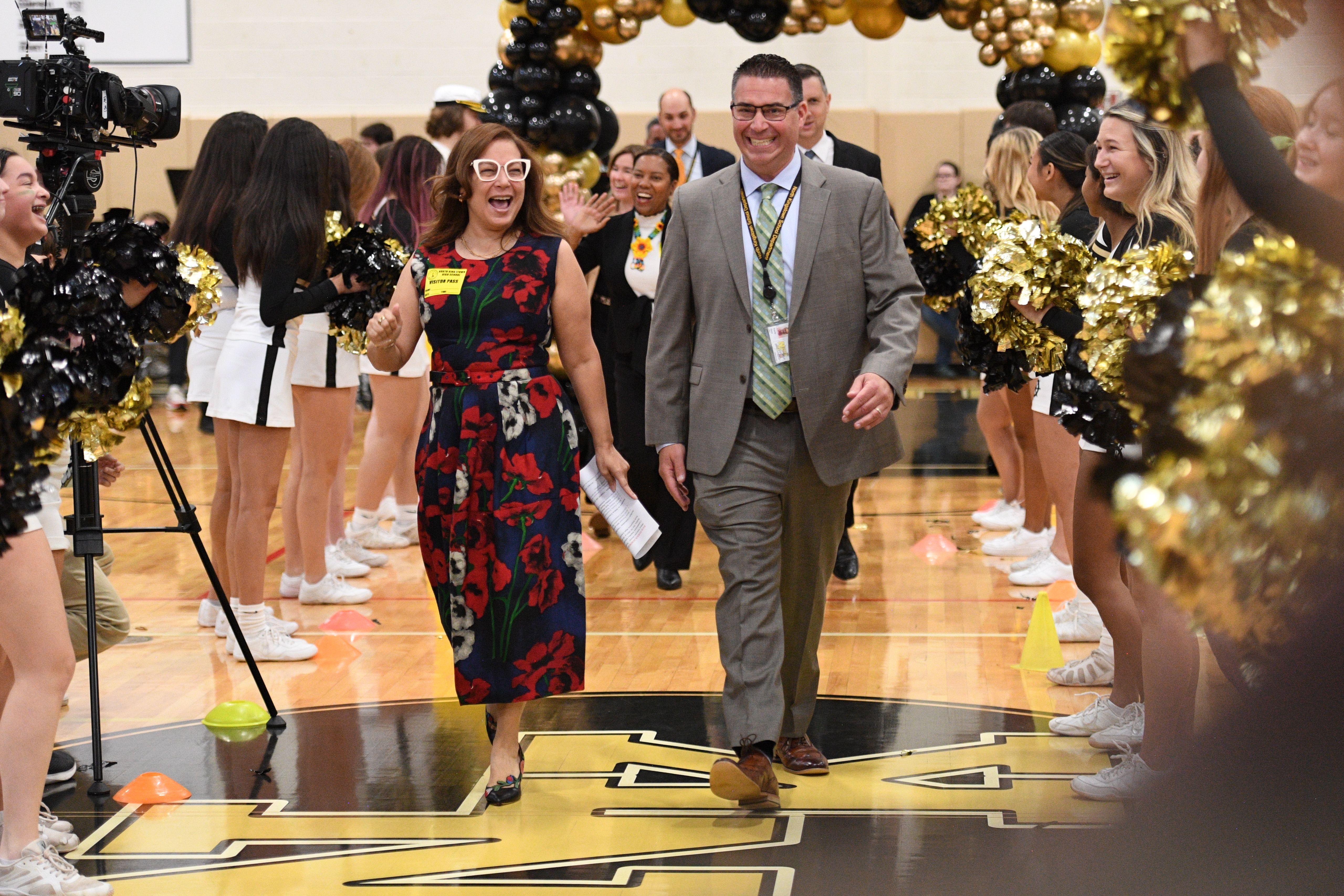 North Kingstown High School | North Kingstown, RI | Oct 10, 2023It's a celebration at North Kingstown High School! Cheerleaders usher in special guests, including Rhode Island Education Commissioner Angélica Infante-Green, North Kingstown School Department Superintendent Dr. Kenneth A. Duva, Rhode Island Lieutenant Governor Sabina Matos and U.S. Congressman Seth Magaziner.