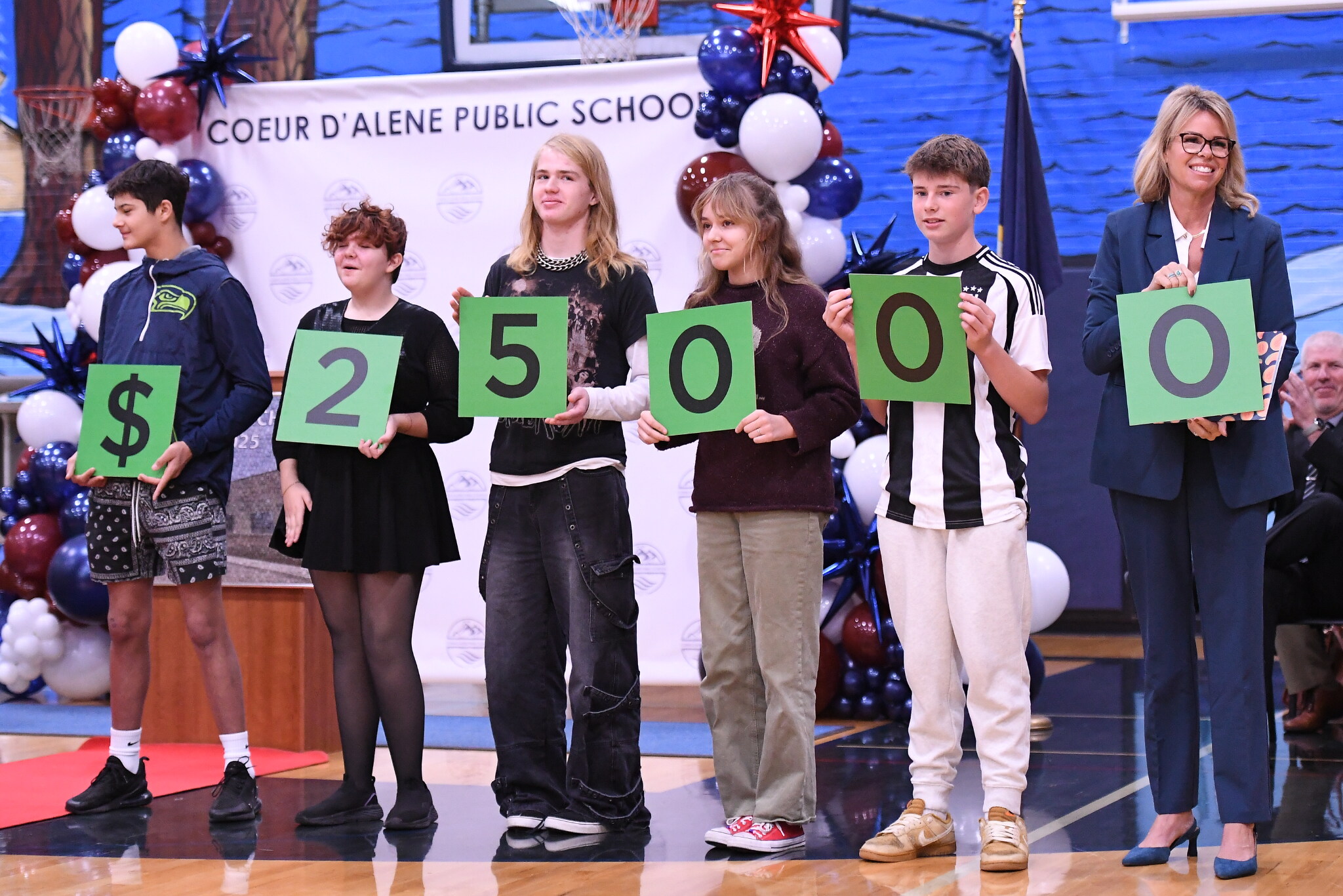 Lakes Middle School | Coeur d'Alene, ID | Nov 20, 2024$25,000! One digit at a time, students, along with Idaho Superintendent of Public Instruction Debbie Critchfield, hold up cards revealing the cash prize amount for today's Award.