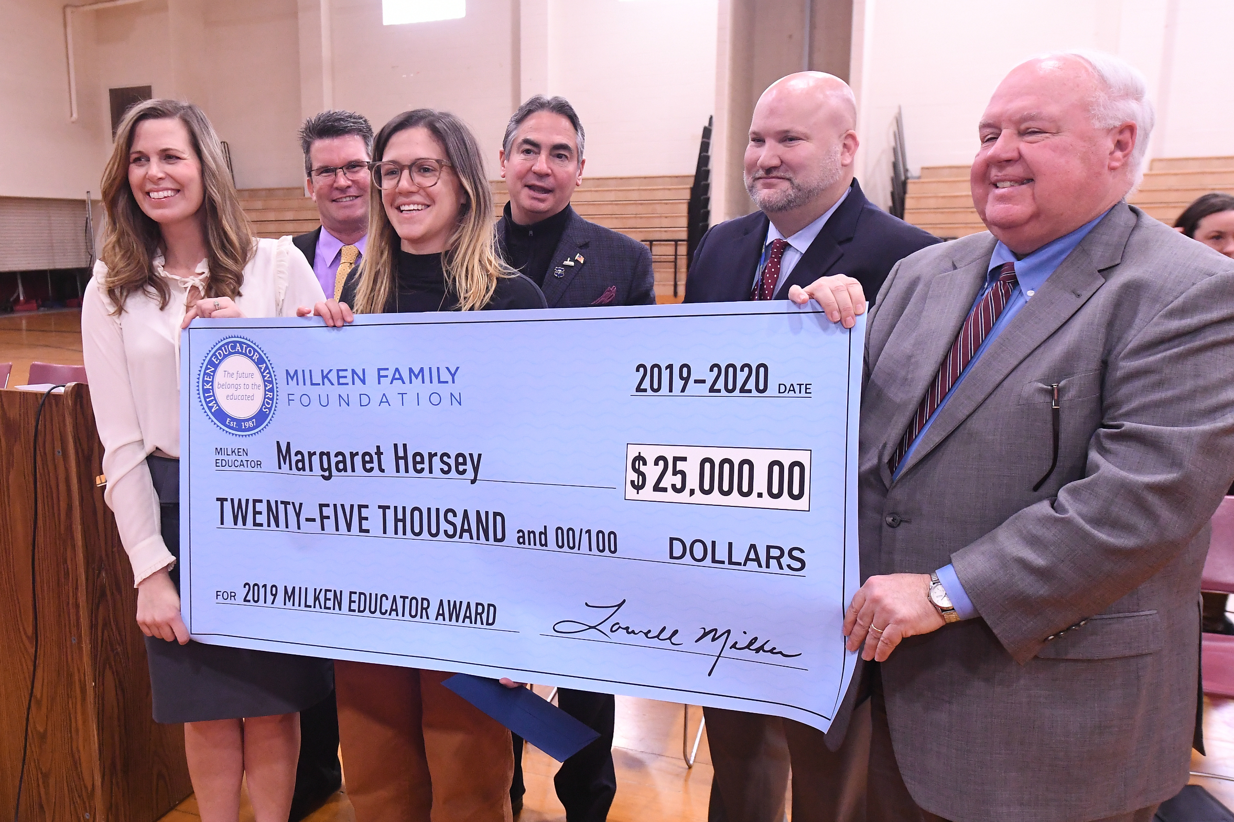 Springfield Honors Academy | Springfield, MA | Dec 04, 2019CONGRATULATIONS! Colleagues and visitors give Milken Educator Award recipient Margaret Hersey gets a hand with her oversized $25,000 check.