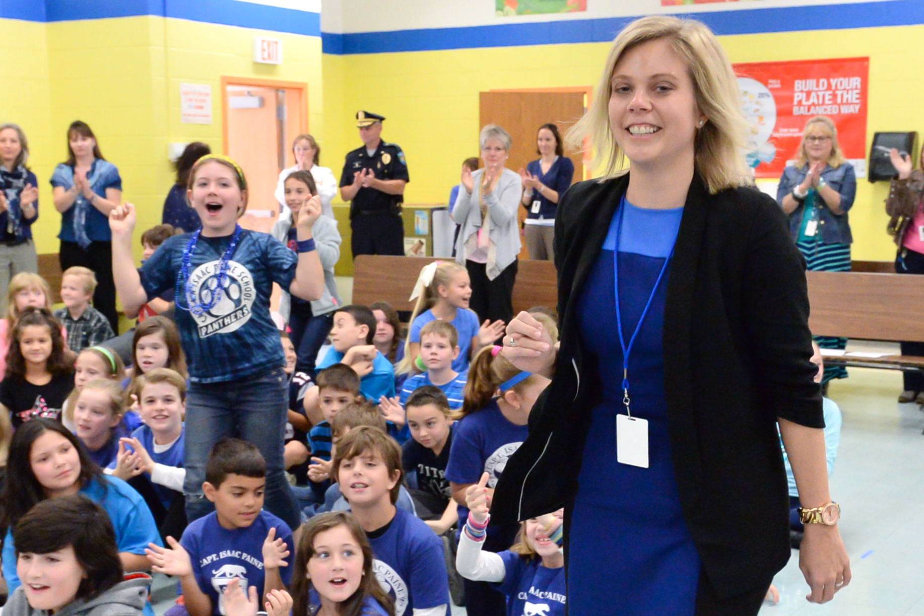 In this photo: Staff and students of Captain Isaac Paine Elementary cheer (and literally jump for joy) in appreciation for Erin Quinlan and the much-deserved honor she just received.