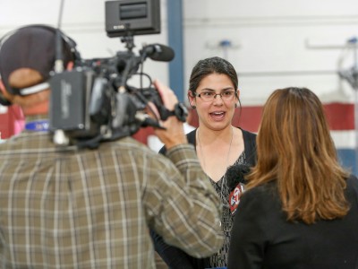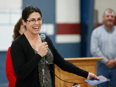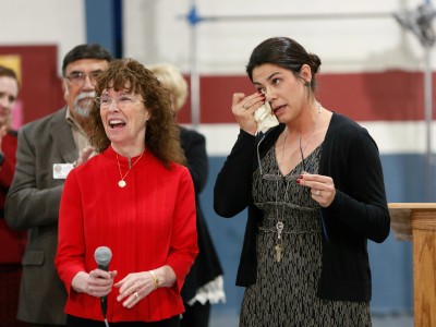 Math teacher Melanie Alfaro addresses the assembly through tears at her surprise Milken Educator Award notification. "I love having an impact on every single one of your lives," she tells the students.