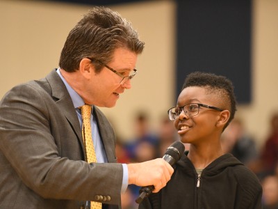 Greg Gallagher, senior program director for the Milken Family Foundation, tells the assembly that good teachers deserve recognition for all their hard work. Every year the Milken Educator Awards celebrates outstanding teachers and administrators across the country—and this year, one of those teachers is right here at Oakland Middle School!