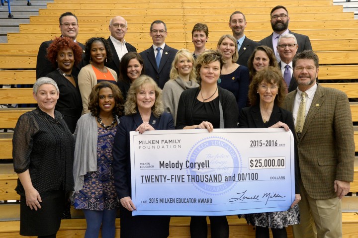 Shortridge High School | Indianapolis, IN | Nov 23, 2015Veteran Milken Educators from Indiana gather around Melody Coryell, the 61st educator to win a Milken Educator Award for the state. Front row, from left: Daphne Draa (IN '04); Candace Ewing (IN '12); Indiana Superintendent of Public Instruction Glenda Ritz; recipient Melody Coryell (IN '15); Dr. Jane Foley (IN '94), senior vice president of the Milken Educator Awards; Rick Crosslin (IN '98). Middle row, from left: Nicole Law (IN '08); Mariama Shaheed-Carson (IN '04); Jessica Heidelberg (IN '06); Kelly Wilber (IN '14); Laurie Davies (IN '14); Sherry L. Annee (IN '01); Dr. Rex W. Bolinger (IN '99). Back row, from left: Wilson Reyes (IN '11); Terrance Levenda (IN'93); Greg Lineweaver (IN '09); Theresa Knipstein Meyer (IN '00); Dr. Lance G. Brand (IN '05); Matt Walsh (IN '03).
