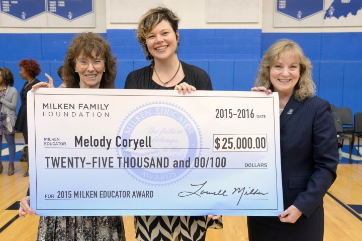 Shortridge High School | Indianapolis, IN | Nov 23, 2015English teacher and International Baccalaureate (IB) Diploma Program Coordinator Melody Coryell beams as she holds her oversized $25,000 Milken Educator Award check. From left, Dr. Jane Foley, Milken Educator Awards senior vice president; recipient Melody Coryell; and Indiana Superintendent of Public Instruction Glenda Ritz.
