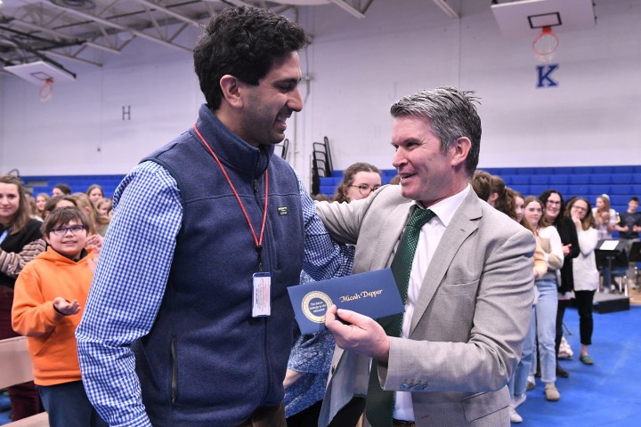 Bath Middle School | Bath, ME | Feb 05, 2025Micah Depper is congratulated by Senior Program Director for the Milken Family Foundation, Greg Gallagher, as students, colleagues and dignitaries give him a standing ovation.