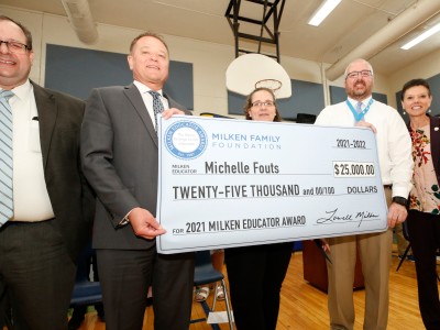Bryant Elementary | Kearney, NE | Apr 27, 2022How much is the Milken Educator Award's cash prize? Students hold up cards representing the amount, one digit at a time. When Nebraska Commissioner of Education Dr. Matthew L. Blomstedt brings in a third zero, the assembly starts to buzz: $25,000!