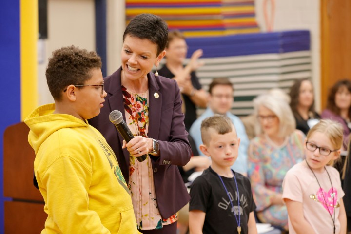 Bryant Elementary | Kearney, NE | Apr 27, 2022What is this big teacher award? Stephanie Bishop, vice president of the Milken Educator Awards, asks a student to help her explain.