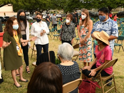 From left, Ken Kang (HI ’17); Jean Miyahira (HI ’90); Geraldine Ichimura (HI ’95); Cheryl Shintani (HI ’92); Ellen Schroeder (HI ’97); Judith Kaya (HI ’93); Kathleen Chock (HI ’92); Ruby Hiraishi (HI ’92); Francine Fernandez (HI ’91); recipient Michelle Iwasaki (HI ’21); Kelly Sutcliffe (HI ’16); Dr. Bebi Zamina Khan Davis (HI ’05); Miki Cacace (HI ’19); Michael Sana (HI ’15); Neal Hirasaki (HI ’97); Irene Yamashita (HI ’98); Kathy Nagaji (HI ’98); Dr. Teri M. Ushijima (HI ’06); and Dr. Jane Foley (IN ’94).