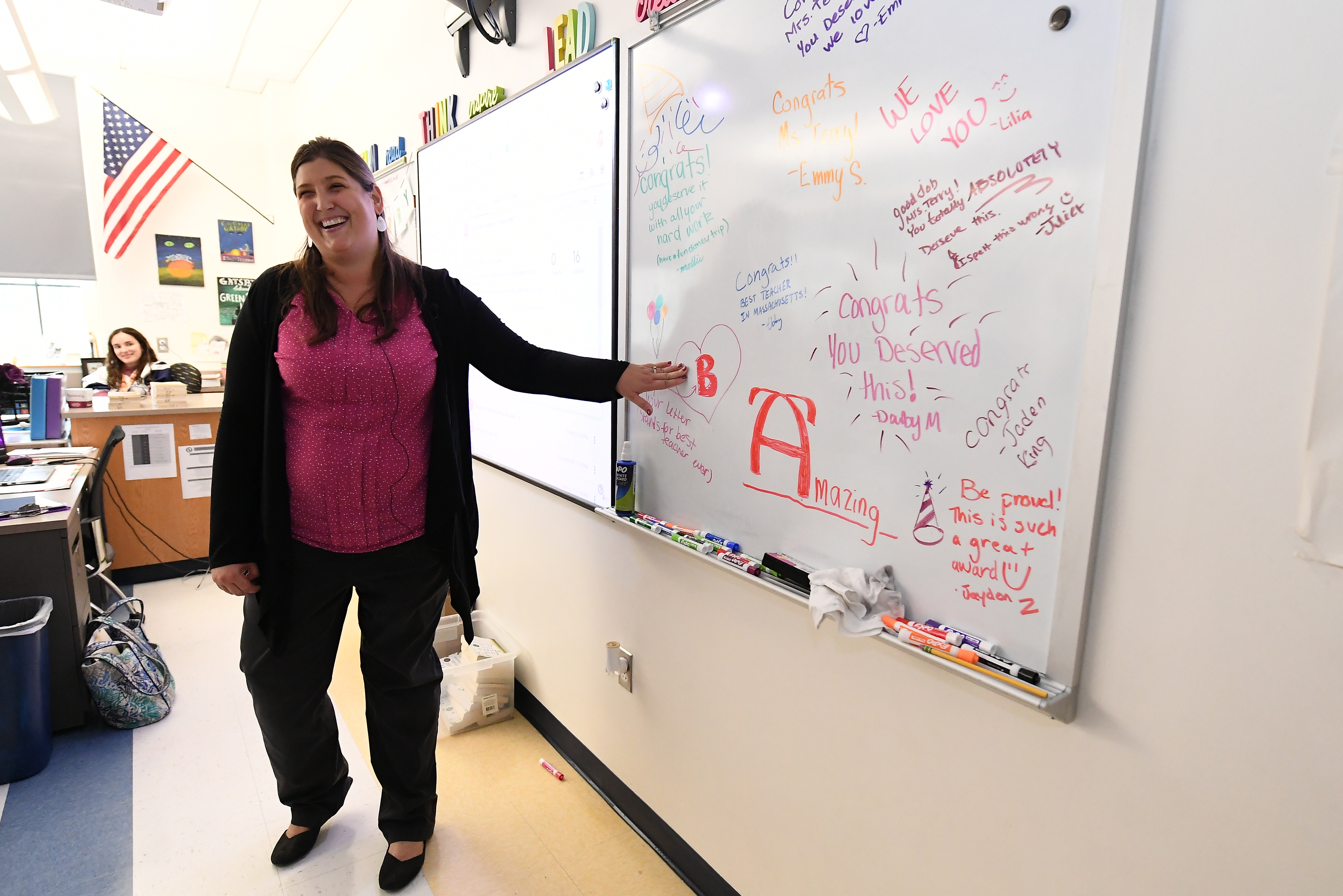 "Congrats! Best teacher in Massachusetts!" Shelley Terry returns to her classroom to find notes of love and congratulations left by students on the whiteboard.