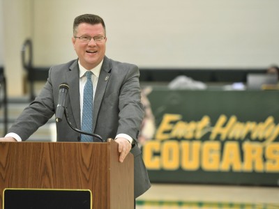East Hardy High School | Baker, WV | Feb 16, 2022THAT'S ONE BIG CHECK! Michelle Wolfe (WV '21, second from right) gets a hand with her oversized $25,000 Milken Educator Award check from (from left) Milken Educator Awards Vice President Stephanie Bishop (VA '01); East Hardy High School Principal Lori Nesselrodt; West Virginia State Superintendent of Schools W. Clayton Burch; and Hardy County Schools Superintendent Sheena Van Meter.